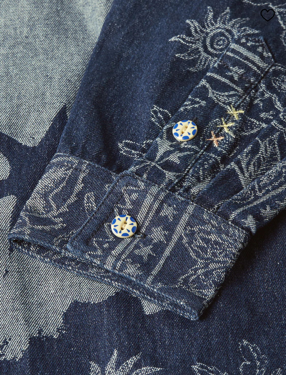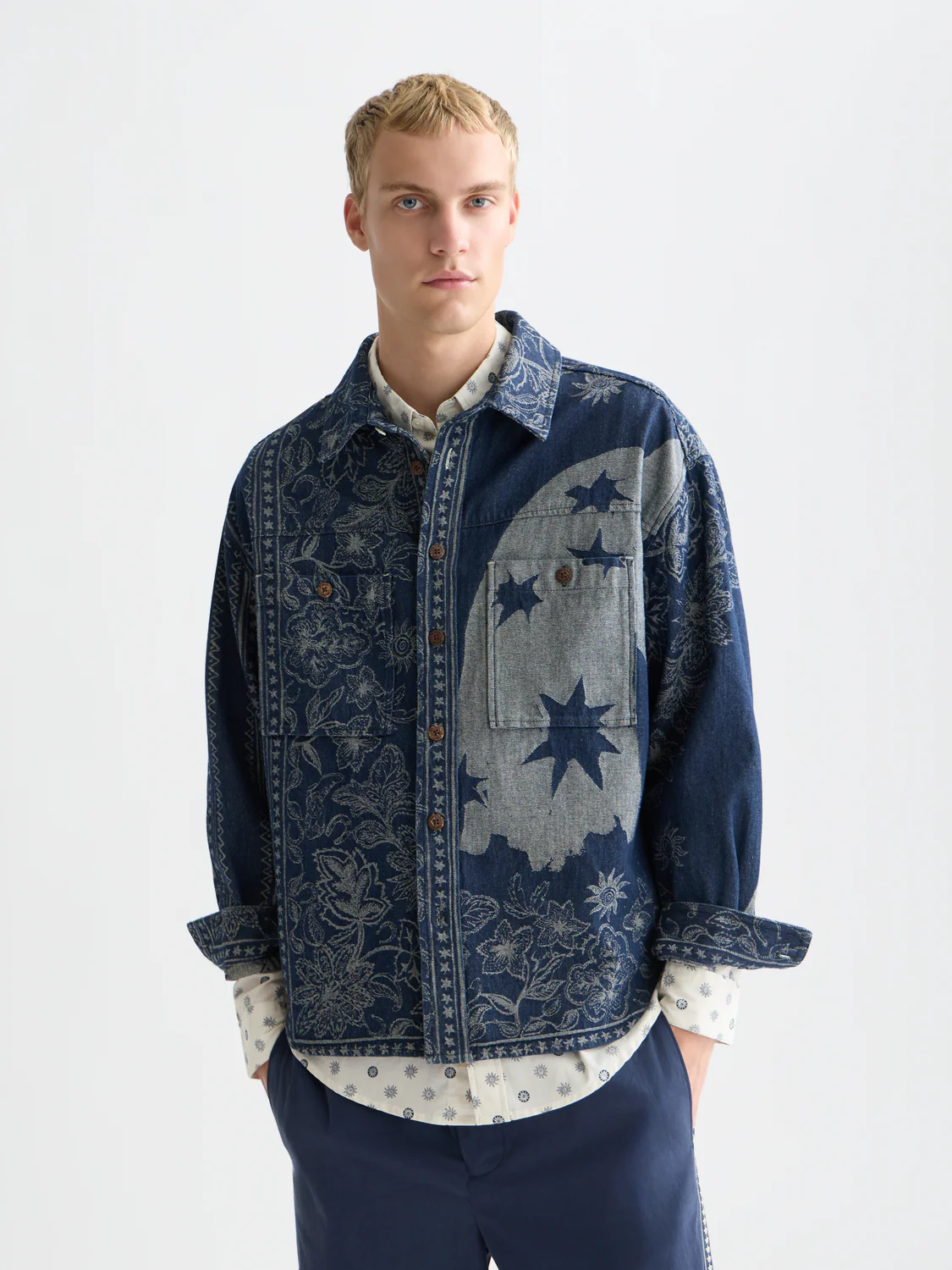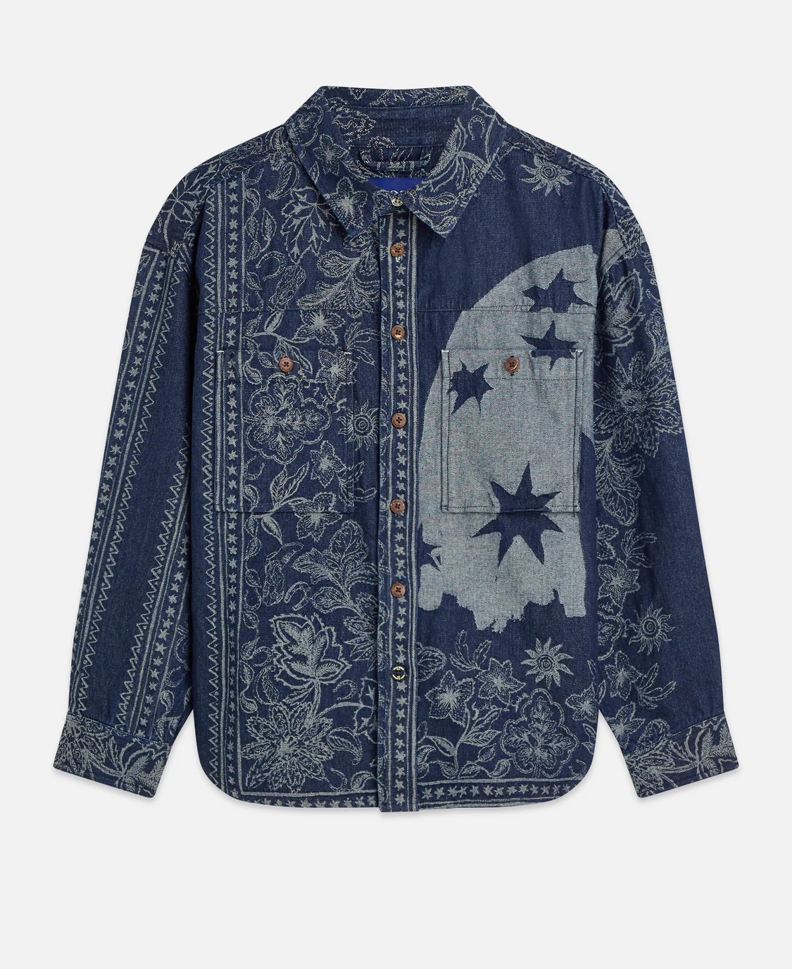 A patterned denim jacquard overshirt with floral and star motifs, offering a relaxed, standout feel.