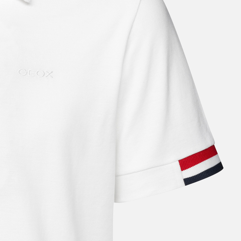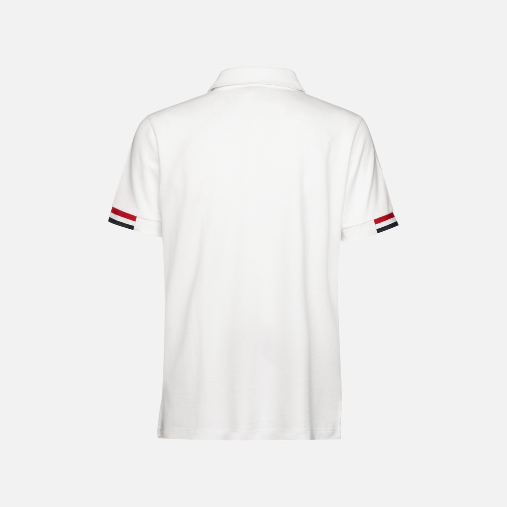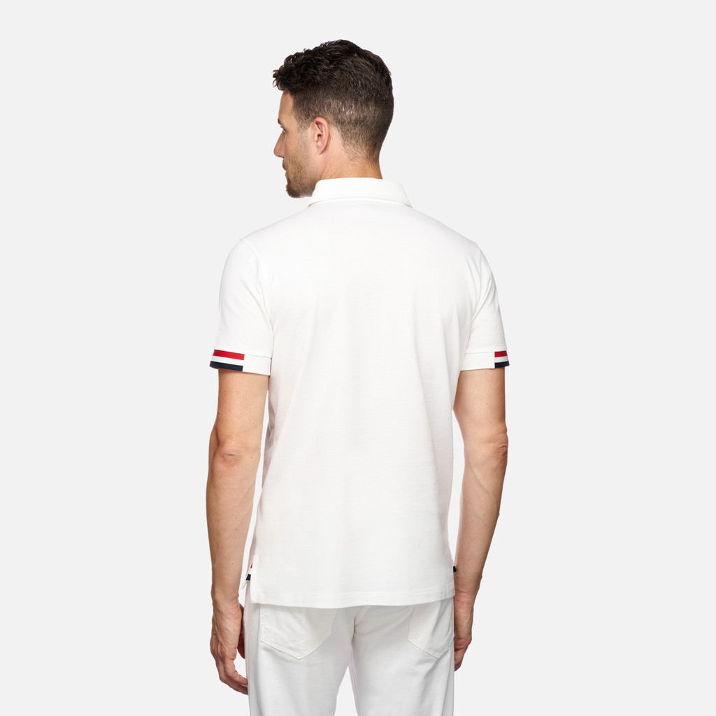 Short-sleeve casual-looking polo shirt for men with vents on either side. It has been cut from piqué cotton in a versatile white palette and features striped details on the sleeve cuffs. This practical and comfortable piece is an iconic addition to any male wardrobe and will effortlessly complete informal city outfits and leisuretime looks.
